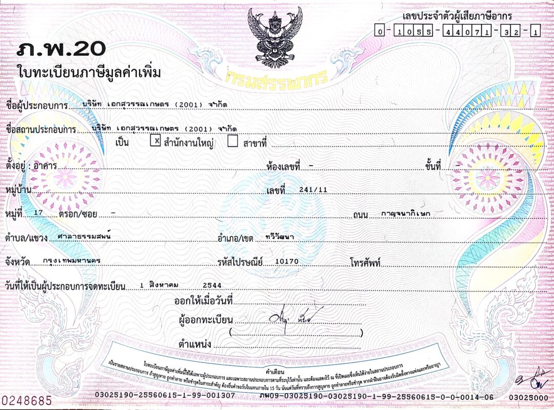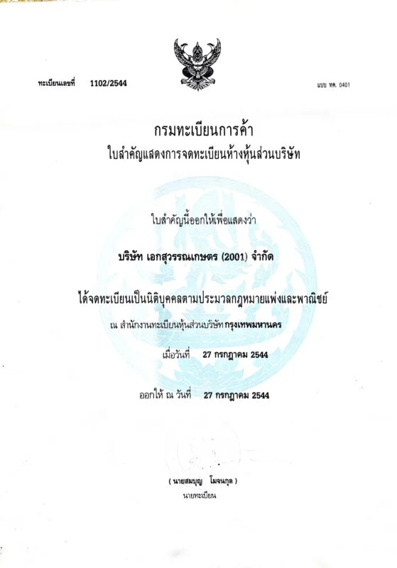 ในปี 2001 เราได้ทำการจดทะเบียนบริษัทและกลายเป็น บริษัท เอกสุวรรณเกษตร(2001) จำกัดจากการที่เราให้คำปรึกษา และตอบโจทย์ลูกค้ามา นับ 100,000 ราย เราได้ค้นพบว่า ไม่ว่าโลกจะเปลี่ยนไปแค่ไหนแต่การเกษตรนั้นไม่เคยเปลี่ยน เราจึงมีความเต็มใจที่จะตอบโจทย์ลูกค้า เพื่อผลผลิตที่ดีขึ้น ชีวิตครอบครัวที่ดีขึ้น และ ปรับตัวให้ทันสมัยอยู่ตลอดเวลา